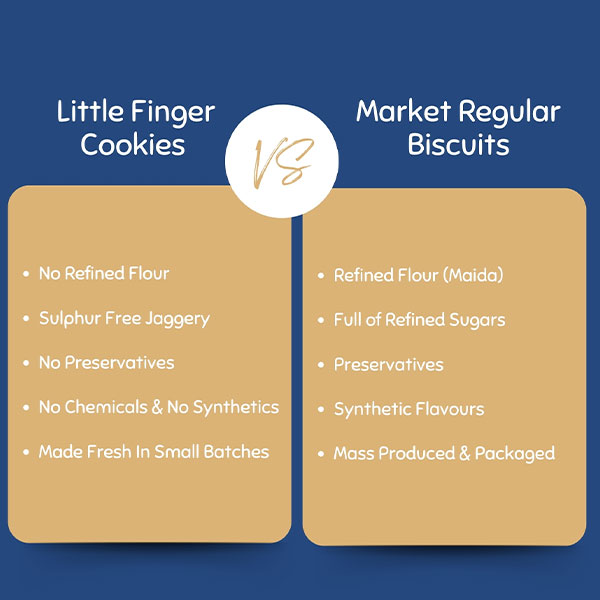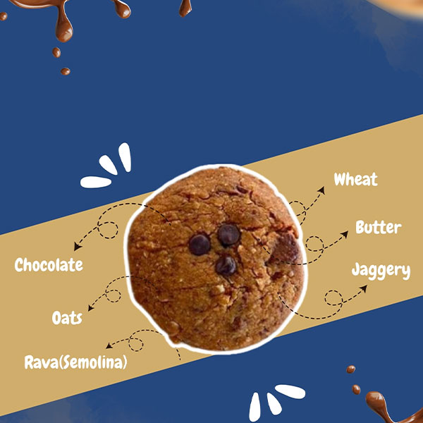 Healthy, wholesome and Nutritious Chocolate-chip cookies made out of Oats, Whole wheat, Semolina, good unsweetened cocoa, sulphur free Jaggery and Dark Couverture Chocolate. No Maida, No refined sugar, No added salt, No preservatives and No synthetic add-ons make them super Nutritious and Healthy.