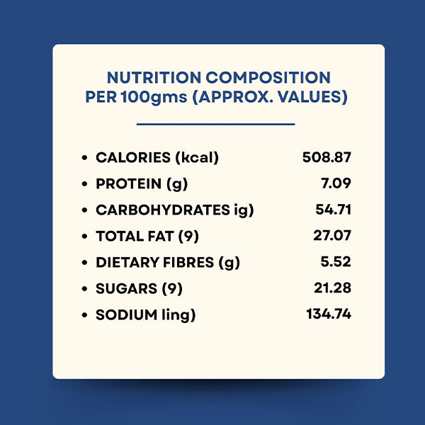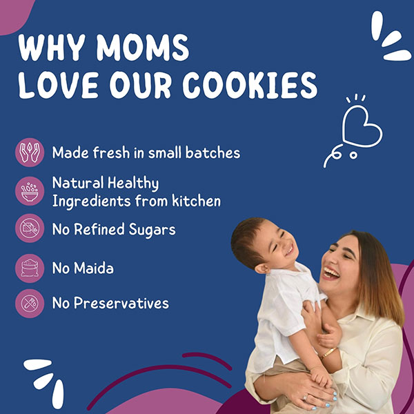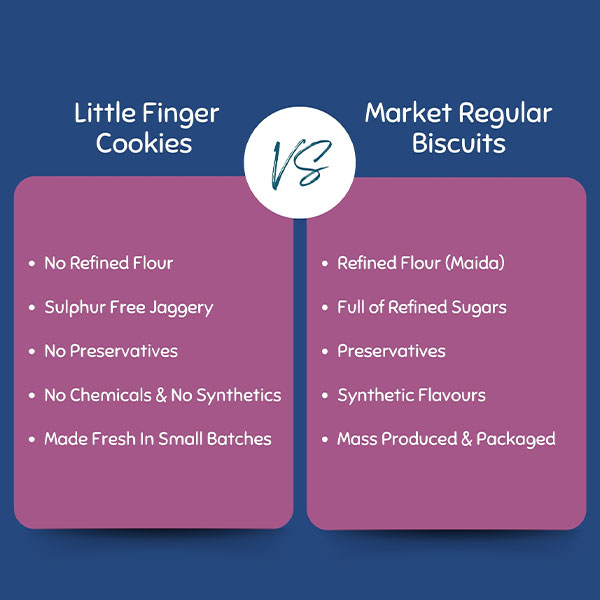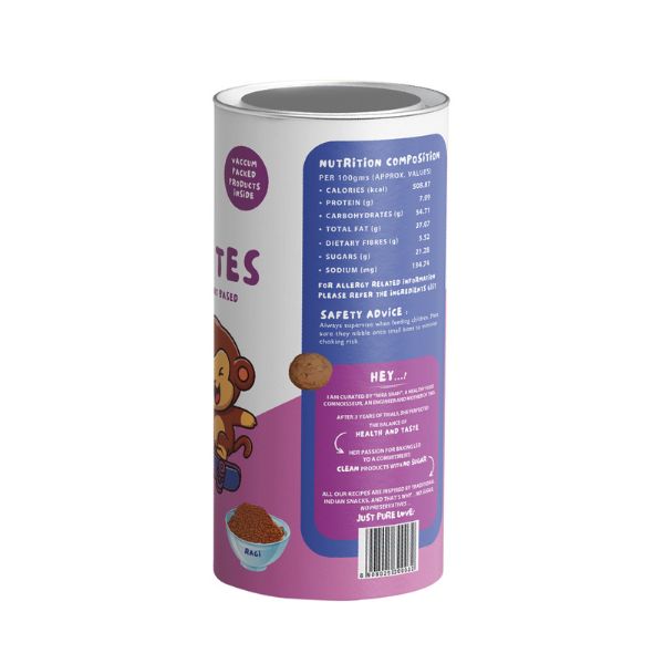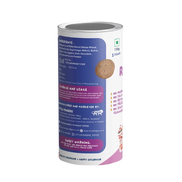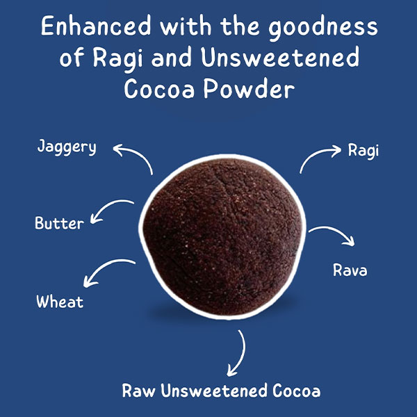 Healthy, wholesome and Nutritious Chocolate flavoured cookies made out of Ragi, Semolina, whole wheat, unsweetened cocoa and sulphur free Jaggery and Dark Couverture chocolate. No Maida, No refined sugar, No salt, No preservatives and No synthetic add-ons make them super nutritious and healthy.